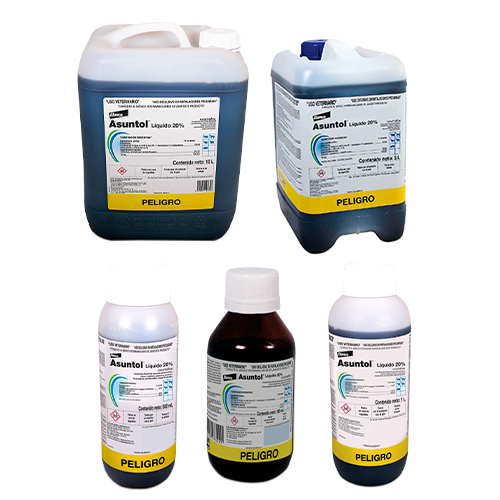 En el caso del uso de Asuntol Líquido 20% en aspersión disuelva 10 ml del producto en 10 lts de agua o 100 ml del producto en 100 lts de agua y revuelva enérgicamente hasta formar una mezcla homogénea. Por medio del baño de inmersión, bomba aspersora, trapo, cepillo o esponja empape al animal enteramente hasta la piel. Su uso en aves se recomienda rociando la mezcla por aspersión directamente en la región de la cloaca, se aconseja un control integral de los ácaros de las aves asperjando también las instalaciones con algún piretroide como Flash Farm. También se puede usar en aves de corral por inmersión (en cubeta o tina) a la misma dosis.